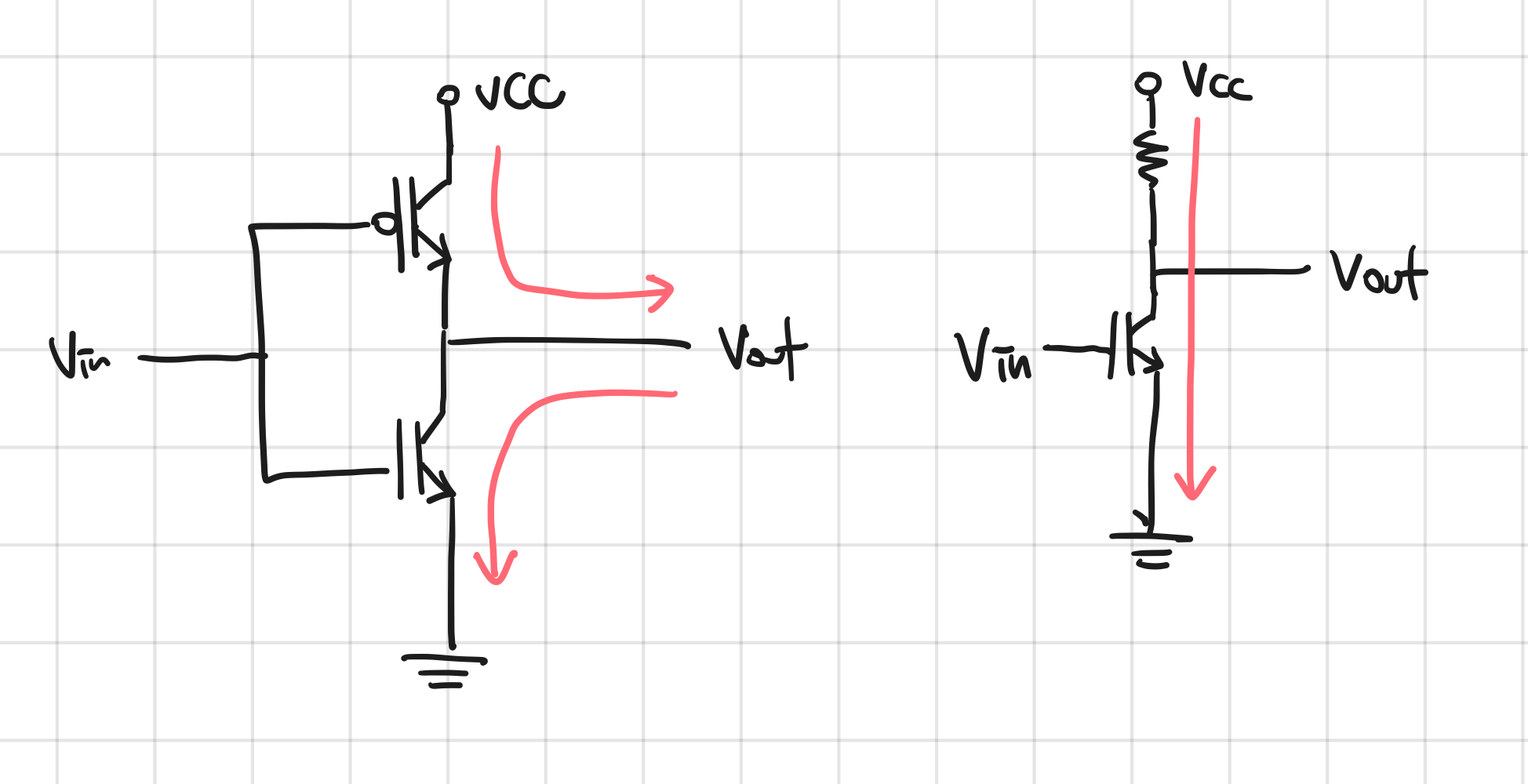 척척 석박사님들께서는 다 생각이 있으셨다. 🎓🎓🎓 만약 오른쪽 회로처럼 구성했다면 Vcc에서 공급되는 전류가 그대로 GND로 빠져나가버린다. 애써 공급한 전류를 그대로 땅에 버려버리는 일. 안그래도 저전력으로 전기를 아껴쓰고 있는데 모든 GPIO 회로에서 이렇게 LOW 신호를 내보낼 때 GND으로 전류를 흘려보낸다면 매우 아까운 일이다. 그래서 왼쪽처럼 MOSFET을 하나 더 사용해서 NOT 게이트를 구성한다. CMOS 상황에서는 Vcc에서 공급한 전류가 Out 핀으로 나가거나 / Out 핀에서 내부 GND 쪽으로 전류가 흘러 들어온다. 적어도 의미없이 아까운 전기를 땅에 꼴아박는 상황이 나오지는 않는다.