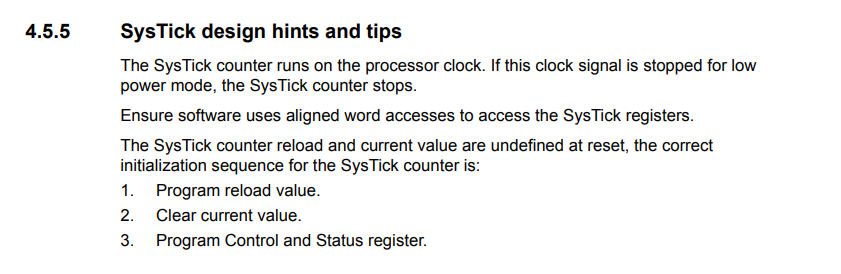 안전한 제어를 위해서 SysTick을 사용하는 방법까지 친절하게 안내가 되어있다. 사실 내가 생각하기에 Control 레지스터에서 SysTick Enable bit만 가장 나중에 하고 나머지 설정하는 것은 순서가 상관이 없을 것 같긴한데, 위 순서를 지켜서 작성해주어야 한다.