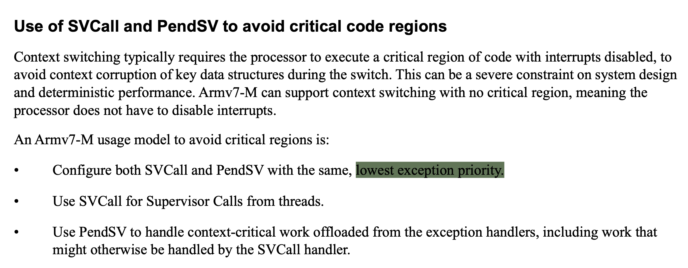 중요한 Exception을 처리하다말고 Context-Switch가 되어버리면서 인터럽트 응답 속도가 떨어지는 문제가 발생할 수 있기 때문에, Context-Switch를 위한 Exception은 우선순위가 가장 낮아야한다 → 우선순위가 실제로 가장 낮거나, 우선순위의 설정이 가능(Configurable)해야한다. 만약 PendSV를 사용하지 않는다고 할 때, SVC의 여러 동작 중 하나로 Context-Switch를 넣어주게 된다면 SVCall Exception의 우선순위가 낮아져야하는데, 이러면 낮은 우선순위로 인해 SVC의 처리 속도가 늦춰지게된다. (이건 원하지 않았던 부작용임)