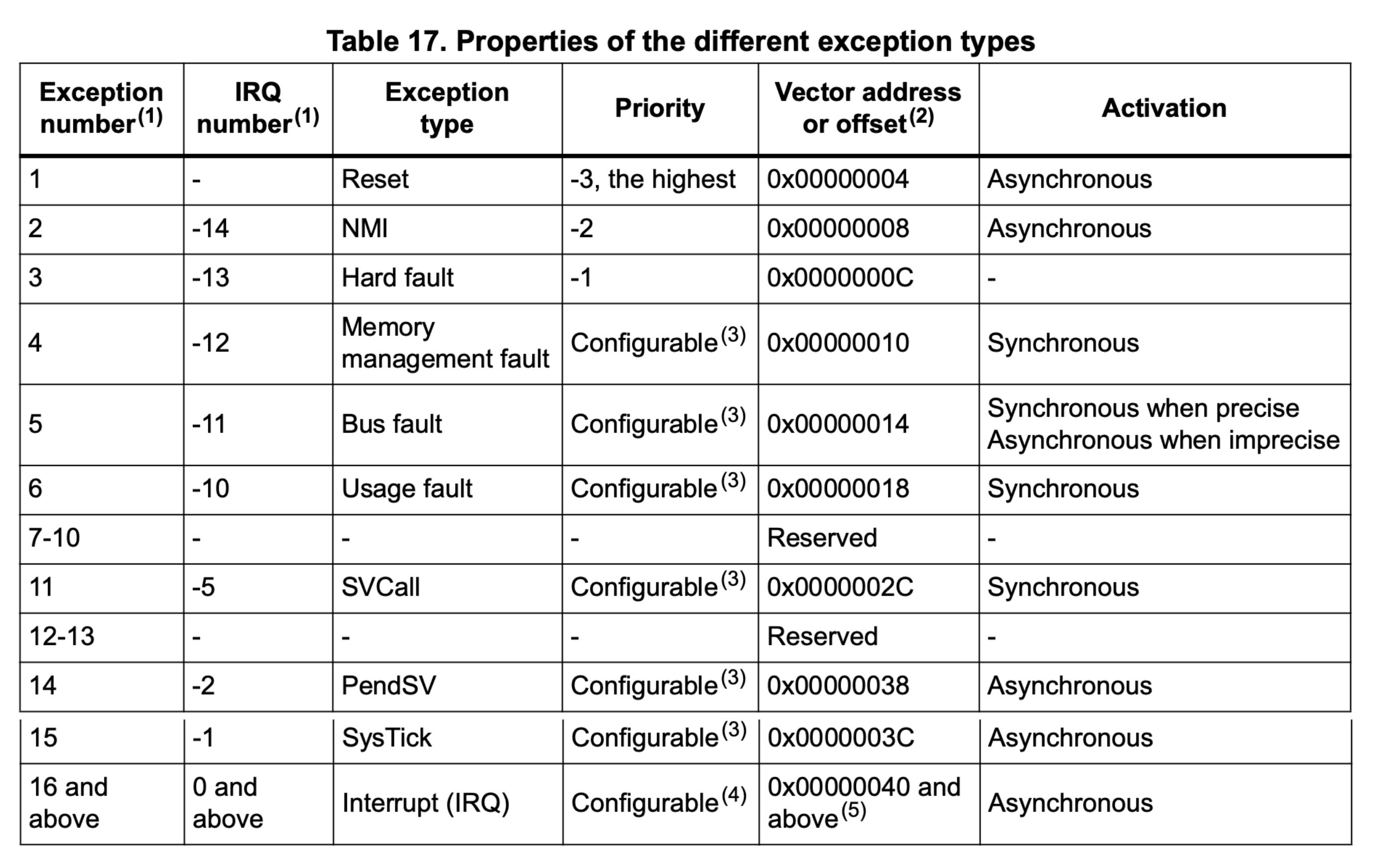 그렇다면 또 궁금한 점이 생겼다. 왜 하필 다른 인터럽트들도 있을텐데 Context Switch를 할 때 PendSV를 부르는거지? Cortex-M에서 가지고 있는 Exception 들을 살펴봤다.