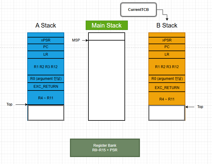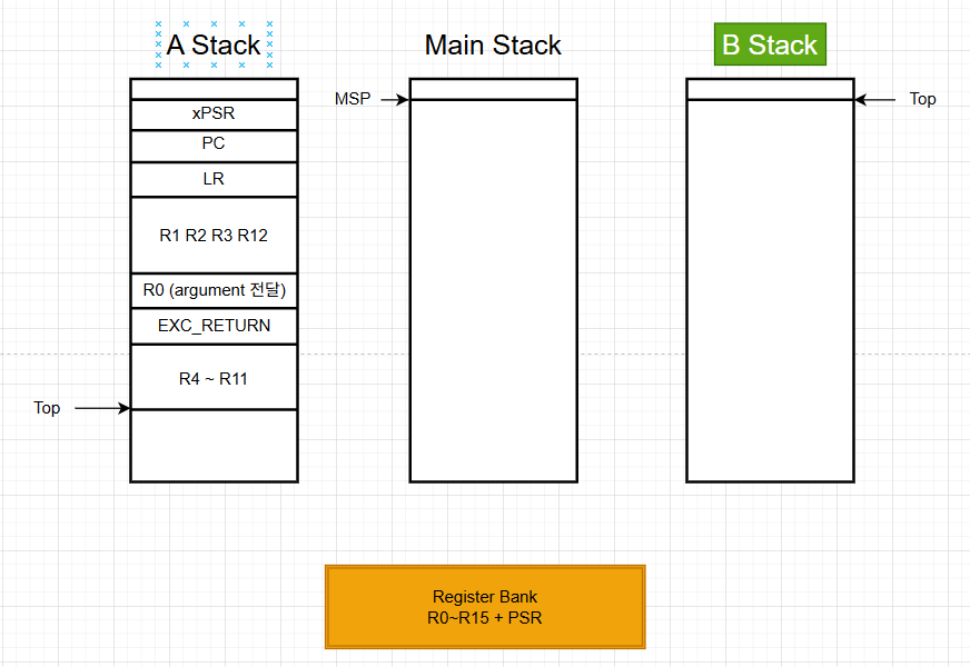 - PendSV에서 Task A 의 실행 환경을 모두 Task A Stack 에 저장