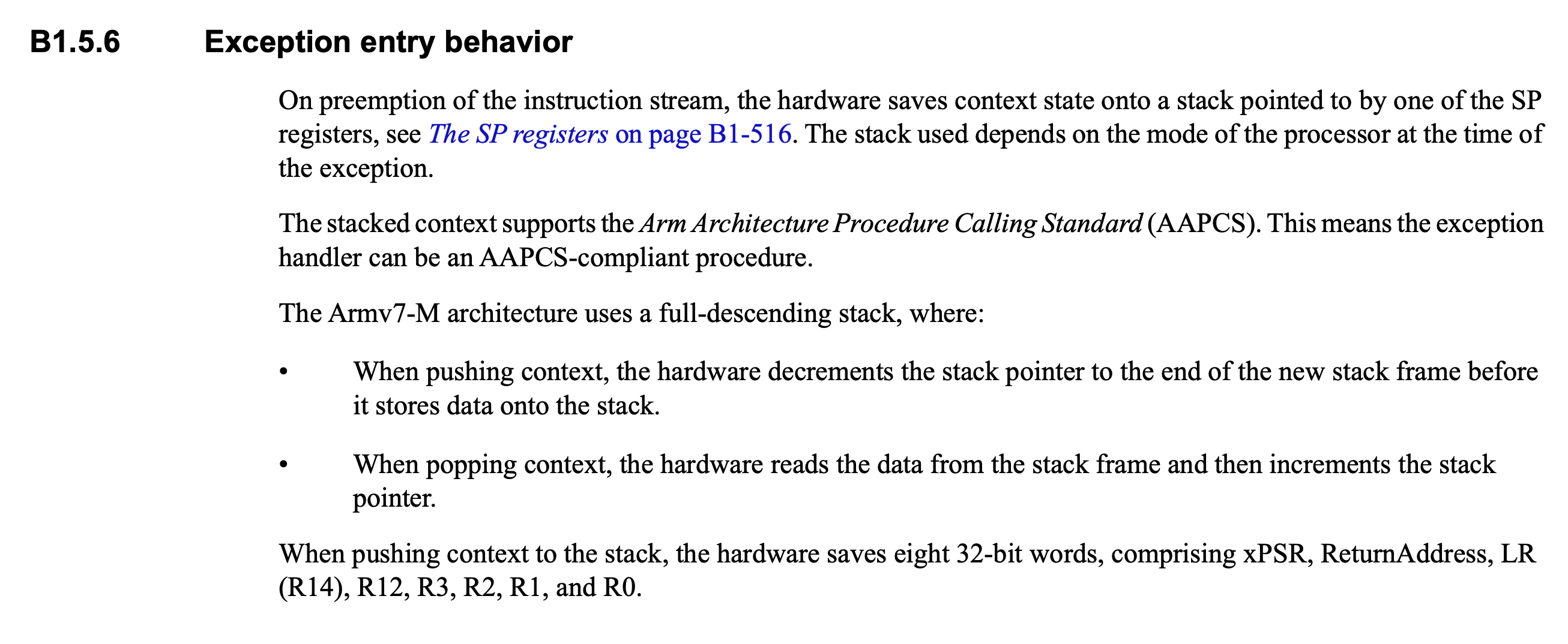 사전 정보) Exception이 걸리면 기본적으로 HW가 8개의 레지스터 정보를 저장한다. 이건 ARM에서 정한 표준이다. Stack에 순서대로 xPSR, PC, LR, R12, R3~R0 을 저장한다. [xPSR, PC, LR, R12] 는 현재 프로세스(Task)의 실행 환경을 저장하기 위함이고, [R3~R0] 은 ‘어떤 어셈블리 코드에서든 함부로 쓰자고 합의한’ 임시 레지스터이기 때문에 다른 Context를 실행하다가 돌아오면 원래 레지스터 값이 남아있을 가능성의 거의 없다. 그래서 HW가 자동으로 저장을 해준다.