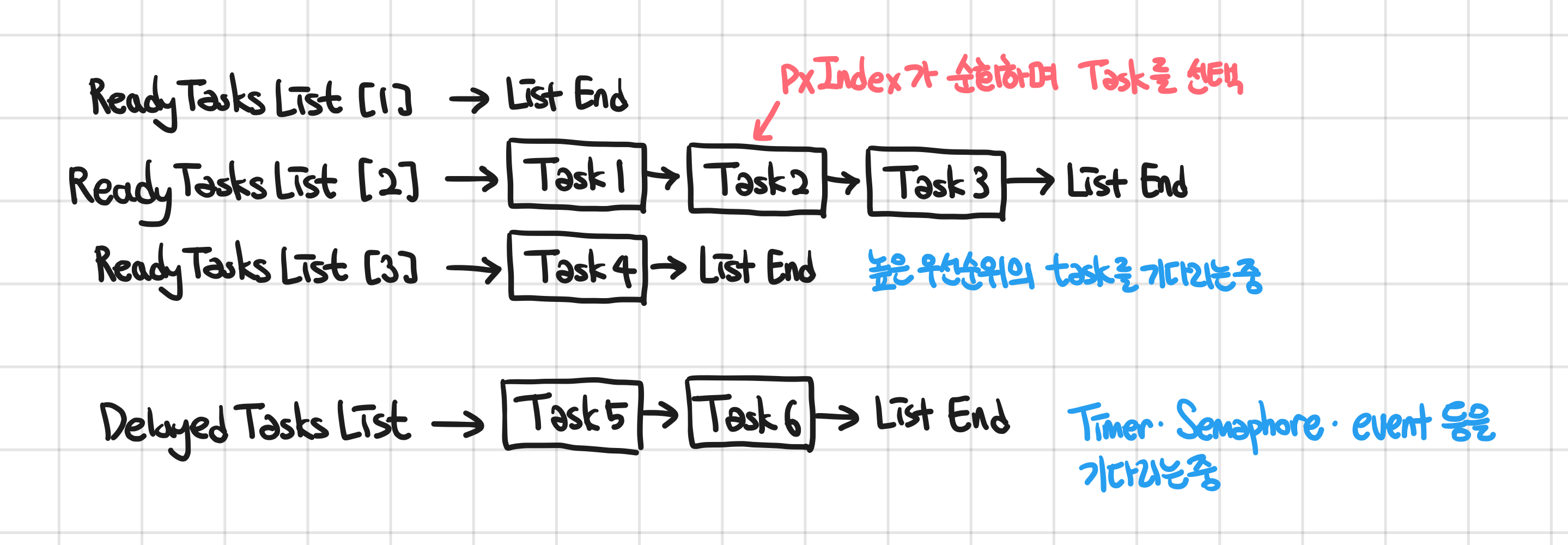 이런 List 구조가 모든 Task State에 대해서 생성되어 있으며, Task 들은 이 List 들에 자신의 ListItem을 이동시키면서 상태를 스케줄러에게 알린다.