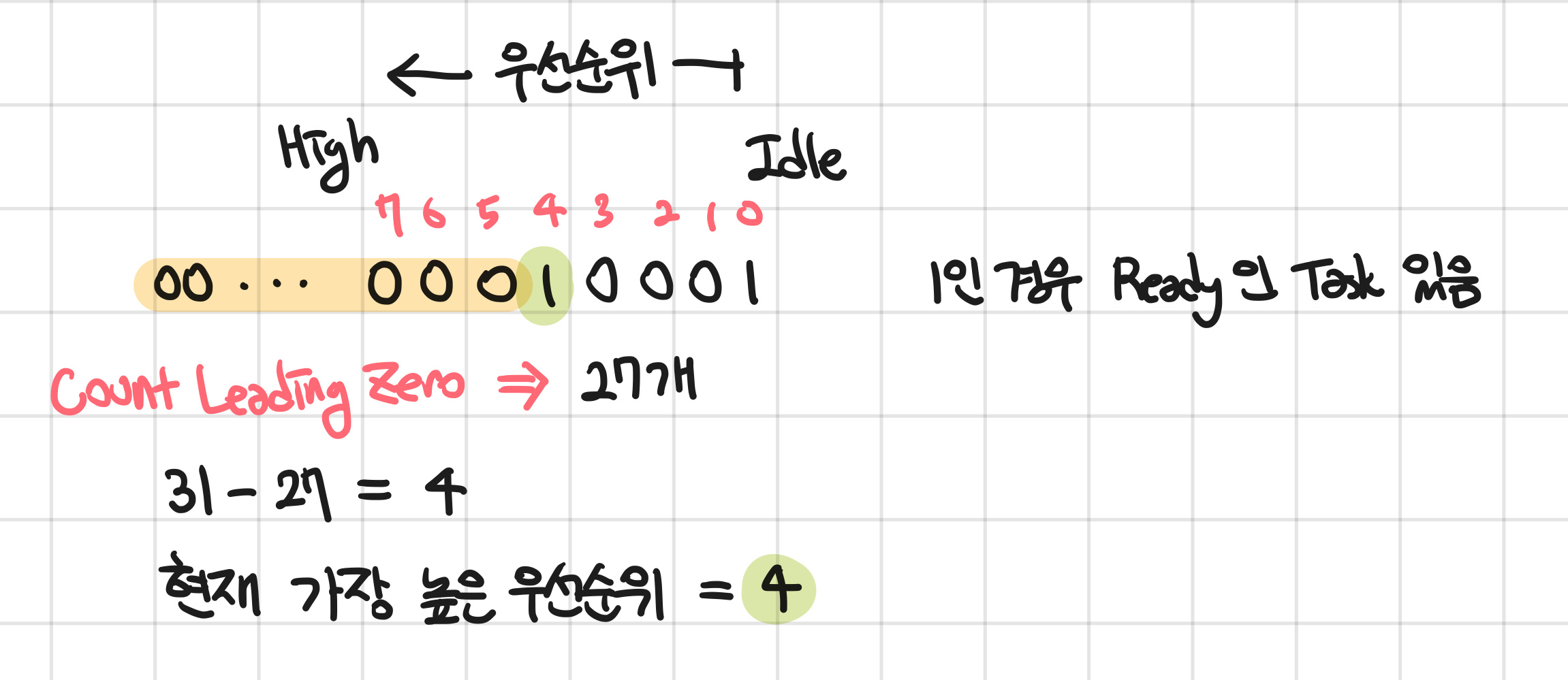 이 함수는 Bit 계산을 통해 현재 Ready 상태인 가장 높은 우선순위가 무엇인지 찾는다. Task 번호나 개수 이런건 중요하지 않음. 그냥 가장 높은 우선순위 Index만 찾는다.