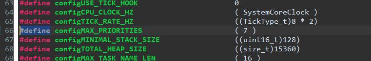 여기에서 Time Slice가 1 Tick 이라고 했는데, Tick의 간격을 조정하기 위한 값에는 2가지 변수가 사용되고 있다. FreeRTOSConfig.h 에서 이 값들을 확인할 수 있다.