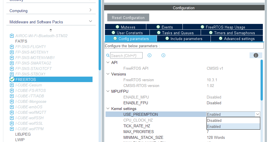 이 설정은 ioc 파일의 FREERTOS Config Params 에서도 동일하게 확인이 가능하다.