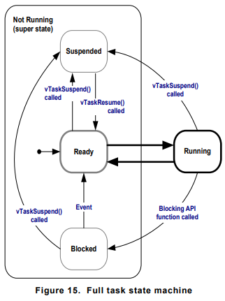 Task는 Running 상태에서 실행되다가, 특정 이벤트를 기다리도록 명령을 받으면 Blocked 상태에서 해당 이벤트가 발생하기를 기다린다. 여기에서 이벤트의 종류는 통신을 통한 비동기적인 입력, Delay의 종료, 세마포어나 뮤텍스, 큐를 통한 신호 전달 등이 모두 포함된다. 이러한 이벤트가 발생하면 Ready 상태로 이동해서 언제든지 스케줄러에 의해 선택만 받으면 CPU에서 실행될 수 있다고 스케줄러에게 알린다. 만약 특정한 상황 때문에 Task 들이 스케줄링이 되면 안되는 상황이 있다면 Task를 Suspended 상태에 보내, 잠시 스케줄링의 대상에서 빼버린다. 예를 들면 Critical Section에 들어가면서 현재 실행중인 Task 만 지속해서 실행이 되어야한다거나 하는 상황. Suspended 상태로부터 Resume을 하면 다시 스케줄링이 가능해진다.