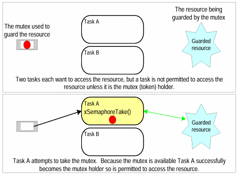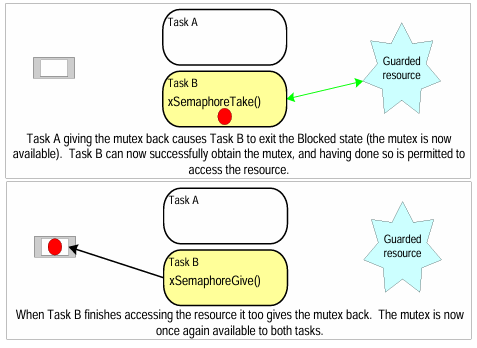 양질의 FreeRTOS Document에 있는 그림이다! Task A와 Task B가 하나의 공유되는 자원을 점유하기 위해서 Mutex를 사용하는 과정에 대해 설명해둔 그림이다.