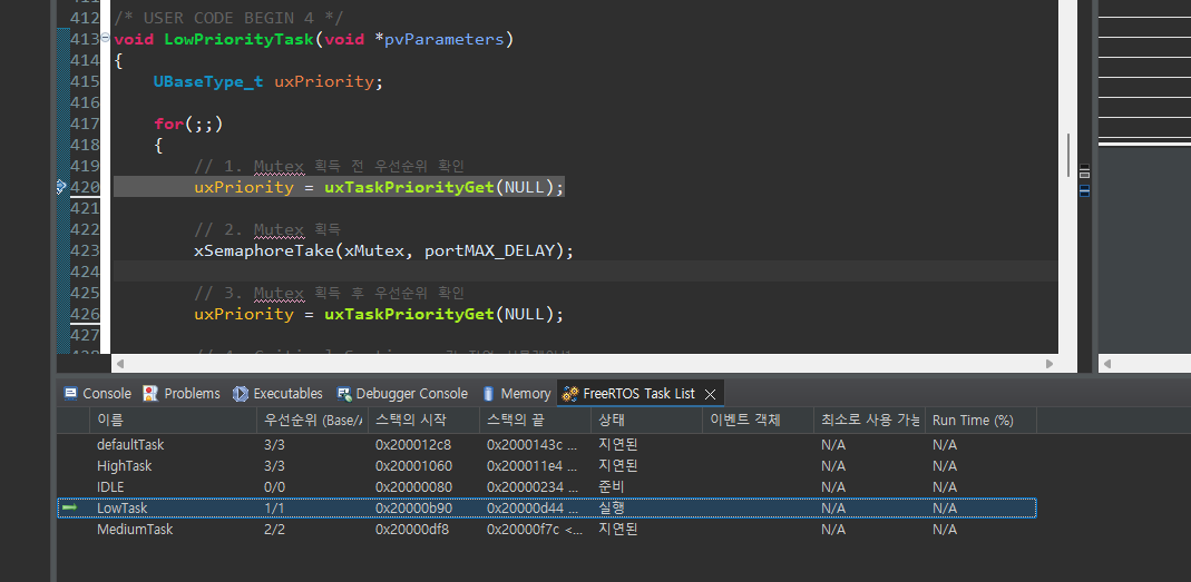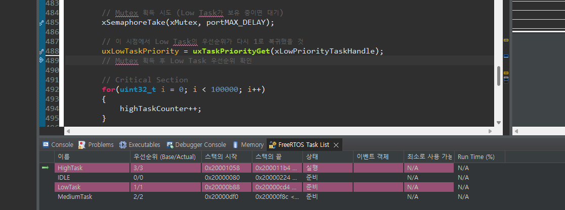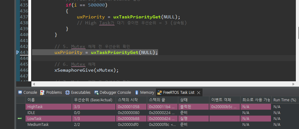 이 지점에서 LowTask가 HighTask와 같은 우선순위로 올라선다! 디버거에서도 LowTask의 Actual Priority가 HighTask와 같은 3으로 올라선 것을 볼 수 있다. HighTask가 LowTask에게 우선순위를 상속해주는 순간이다!