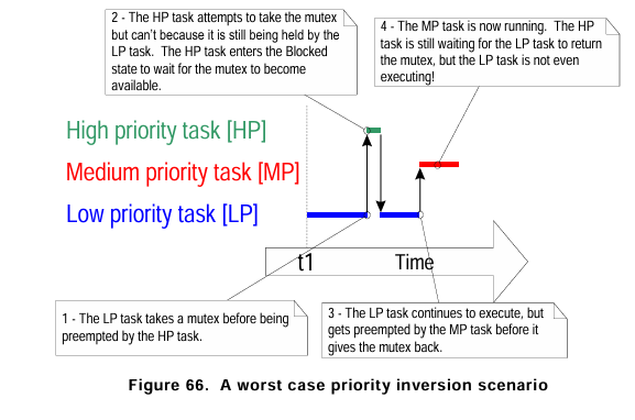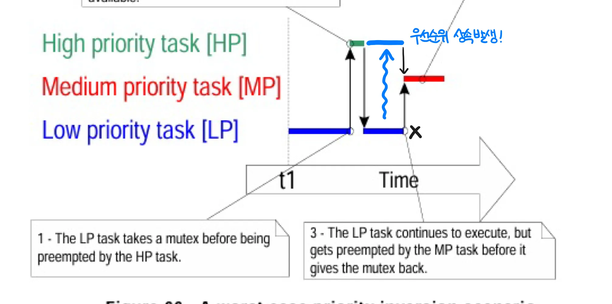 위 그림에서 3가지 우선순위의 Task가 실행되고 있다. 위 상황에서 우선순위의 역전이 발생하고 있다.