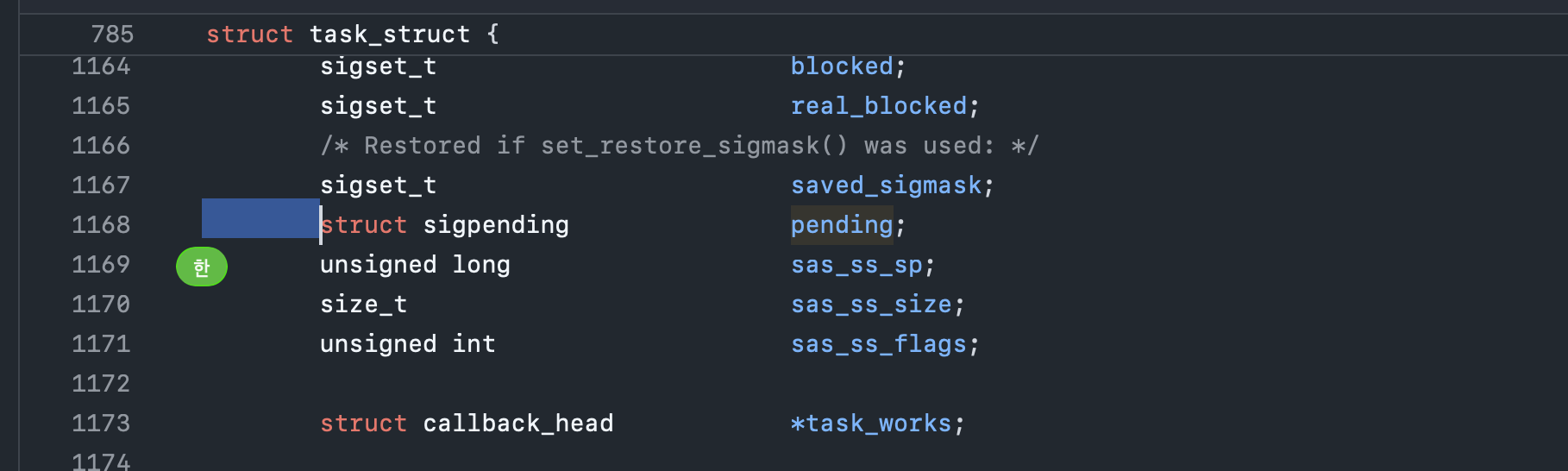 생성된 시그널은 커널의 명령에 따라 타겟 프로세스의 Pending 시그널 목록에 기록된다. 코드 상에서는 PCB를 표현한 task_struct 구조체에서 확인할 수 있었다. 커널은 이 pending 에다가 현재 처리가 필요하다고 신호를 남긴다.