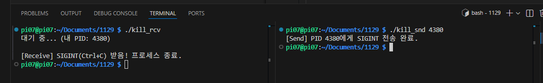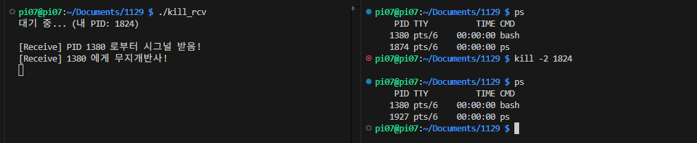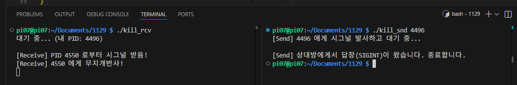 실제로 위 코드를 실행해보면, 오른쪽 sender에서 SIGINT 신호를 보냈고, 이걸 좌측 receiver 가 받았지만 누가 보냈는지 찾아내어 해당 pid를 가진 프로세스에게 다시 SIGINT롤 보내고있는 것을 볼 수 있다.