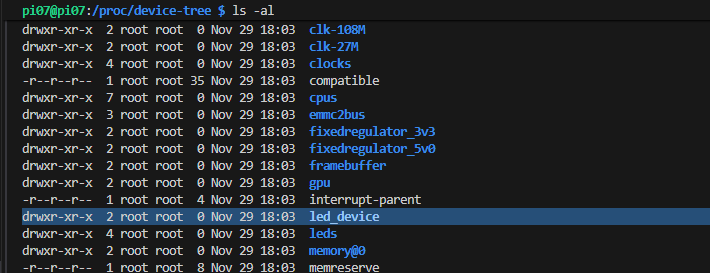 그러면 방금 우리가 만들어준 설정대로 sysfs 파일인 led_state가 led_device 아래에 쇽 들어온 것을 볼 수 있다. 이 파일의 권한도 664로 설정한 대로 그대로 들어와있다. (저번에 살펴본 것처럼, 파일 크기가 4096 ? 이거 sysfs 파일일 가능성이 매우 높다)