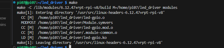 그다음, make 명령어로 만들어준 드라이버 코드를 컴파일하여 led-gpio.ko 파일을 만들어준다.