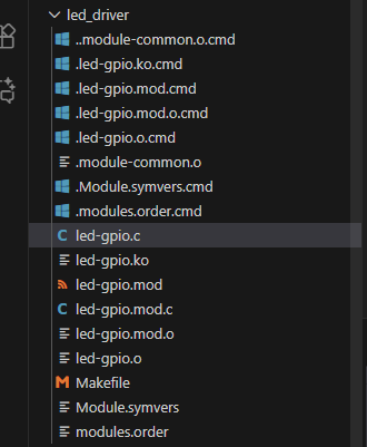 ~/led_driver 라는 폴더를 하나 만들어주고, 아래 2개의 파일을 추가해보자. 위에 있는 led-gpio.c 파일은 디바이스 드라이버의 소스코드이고, 아래 Makefile 은 이를 빌드하기위한 파일이다.