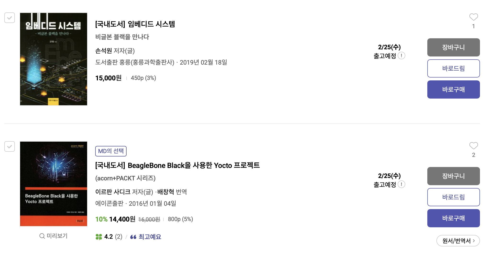 비글본 역시 검색해봤을 때 추천하는 사람이 많은걸 보면 커뮤니티나 자료가 꽤 있을 것 같긴 한데, 국내 자료는 그렇게 많이 있는지 모르겠다. 도서 같은 경우에도 교보문고에 라즈베리파이를 검색하면 170건이나 나오는 반면, 비글본을 검색해봤을 때는 단 2개가 나온다.