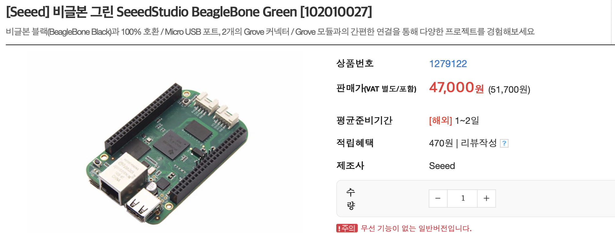 이왕 공부하는거 라즈베리파이보다 조금 더 임베디드 개발스러워보이고, 내가 경험해보지 못한 부분을 한 번 파보고 싶어서 비글본 블랙 보드를 구매해보고자 했다. 어디가 더 저렴할 지 열심히 사이트들을 돌아다니면서 판매처를 검색해보고 있었는데, 왠걸? 비글본 블랙 말고 비글본 그린 같은 다른 시리즈가 눈에 들어왔다. 심지어 비글본 블랙 가격의 절반 수준!