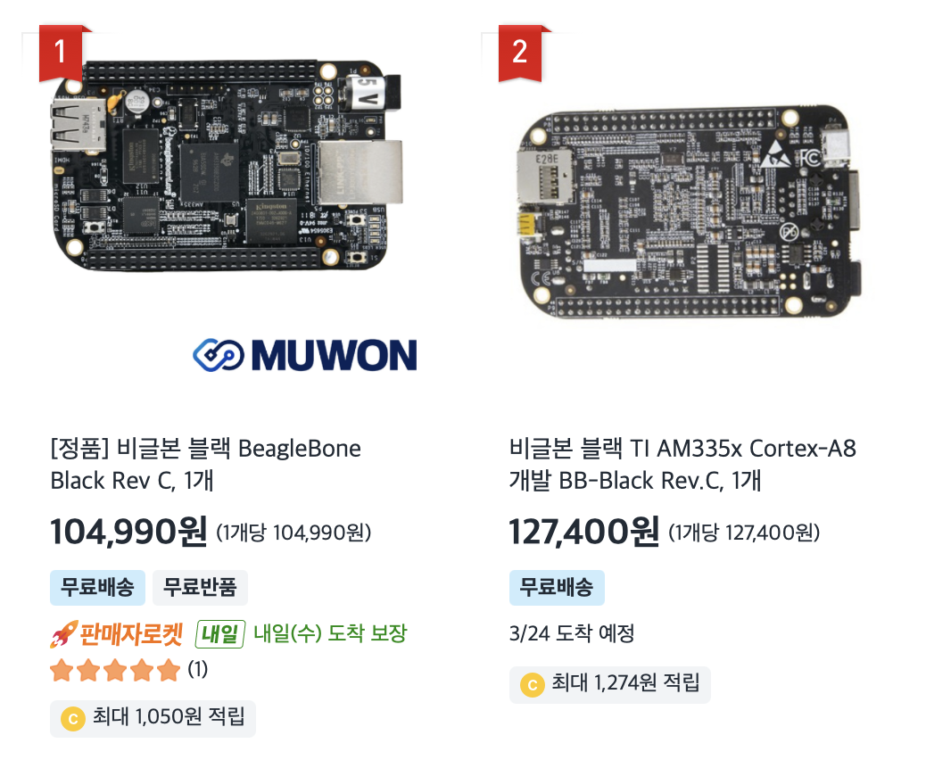 그래서 우여곡절 끝에 내가 구매한 리눅스 개발보드는 BeagleBone Black 이고, 5만원에 구매할 수 있었다. 지금 배송이 오고 있는 중이다.