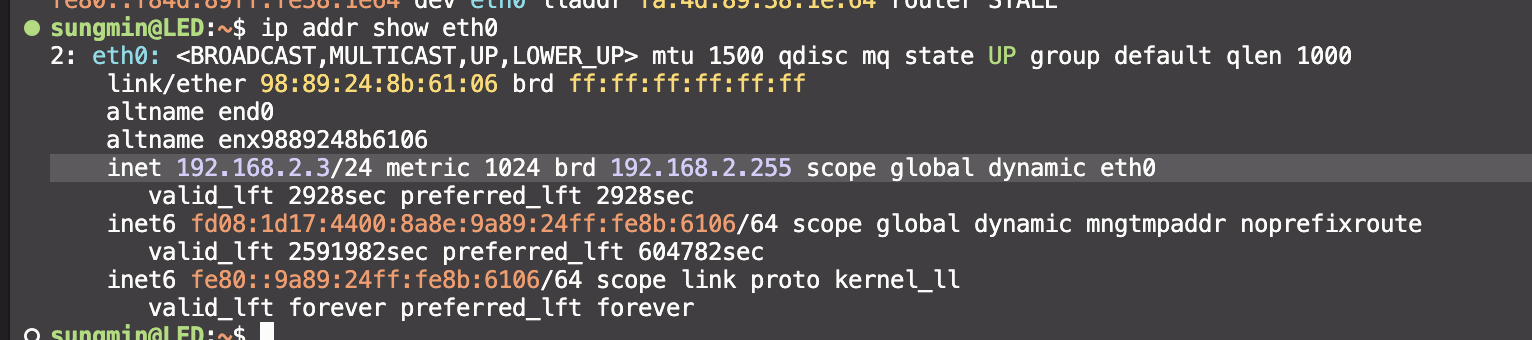 실제로 보드 SSH 연결한 곳에서 이더넷의 설정값들을 확인해보면 IP 주소가 192.168.2.3으로 되어있음을 체크할 수 있다.