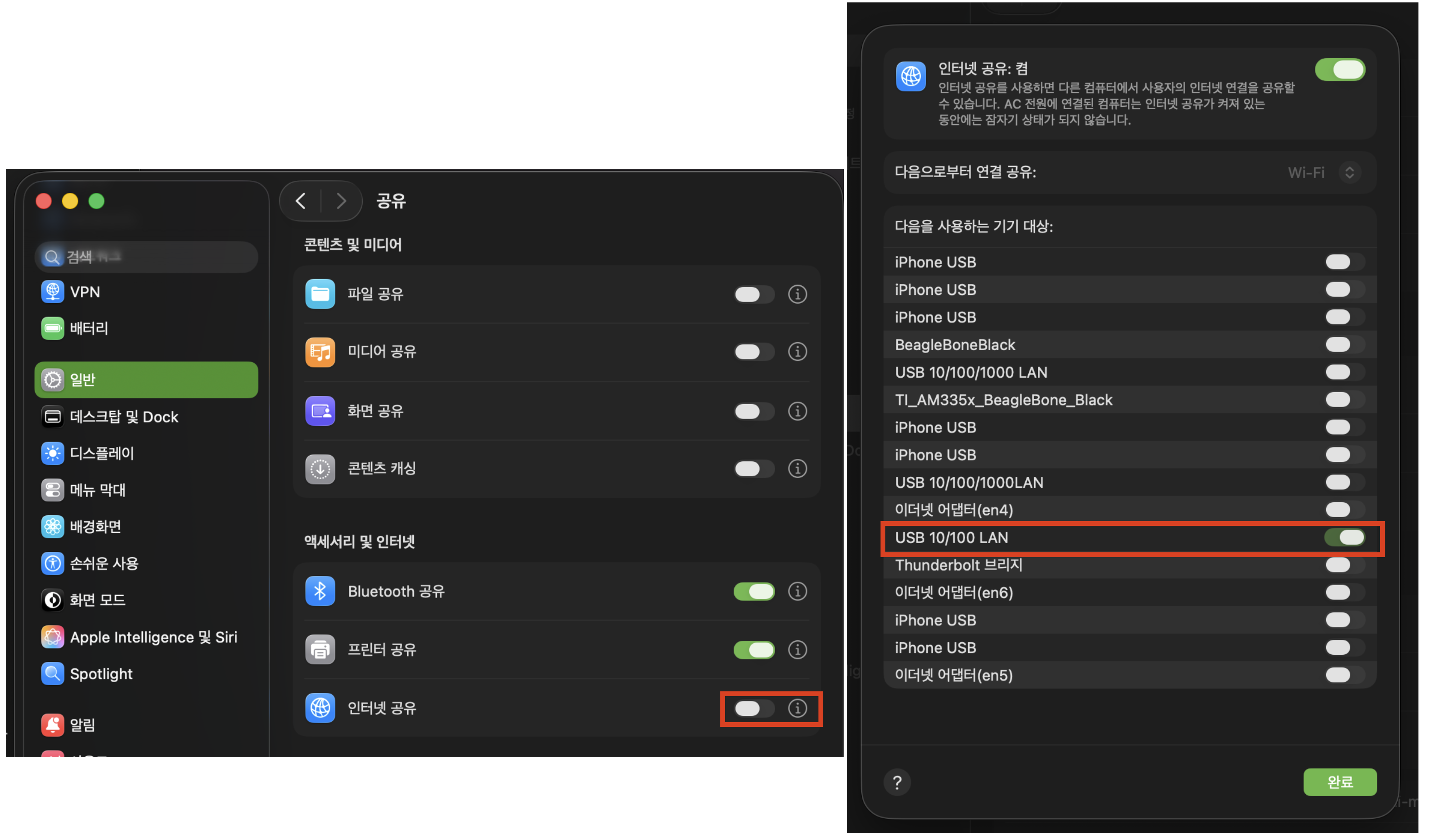 설정 > 일반 > 공유 > 인터넷 공유를 확인한다. 인터넷 공유를 켜면 Mac이 Router의 역할을 하기 시작한다. 그러면 연결되는 장치에 대해 이때부터 자동으로 IP 주소를 할당해주는 역할을 수행할 수 있다. 그래서 이걸 켜준 다음 LAN을 꽂아야 자동으로 보드에게 IP 주소를 할당해주게 된다.