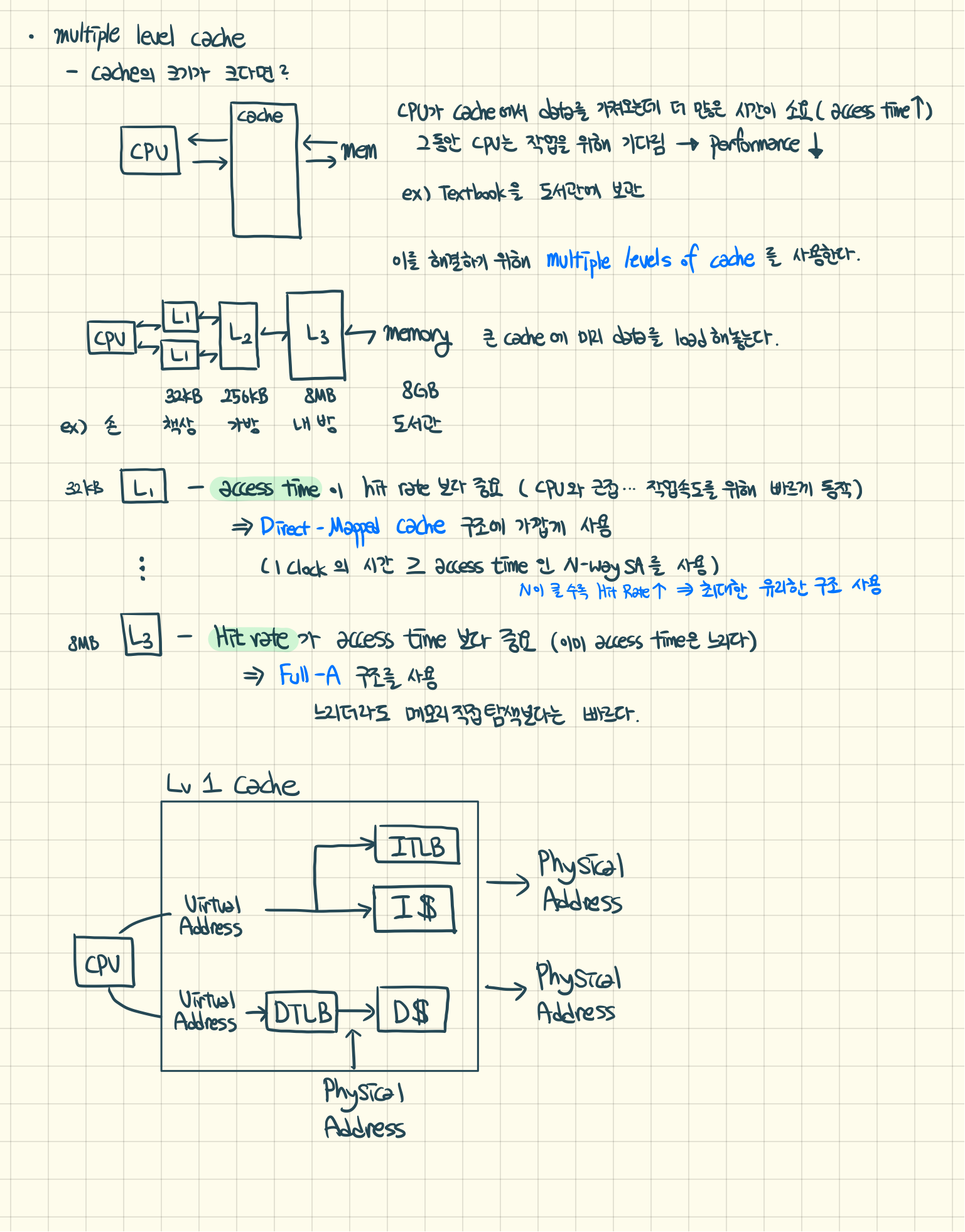 Access Time이 hit rate 보다 중요하다. ( CPU와 근접하므로 작업속도를 위해 빠르게 동작할 필요가 있다. )