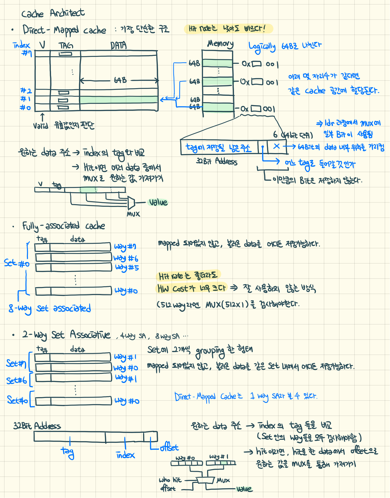 메모리 Set이 하나이고, Way가 여러 개인 구조. 512개의 Way가 있으면 MUXs에 512개가 한 번에 연결되어있어, 굉장히 복잡한 HW 구조가 된다. 이에, 두 구조를 적절히 섞은 Cache구조를 설계하였따.