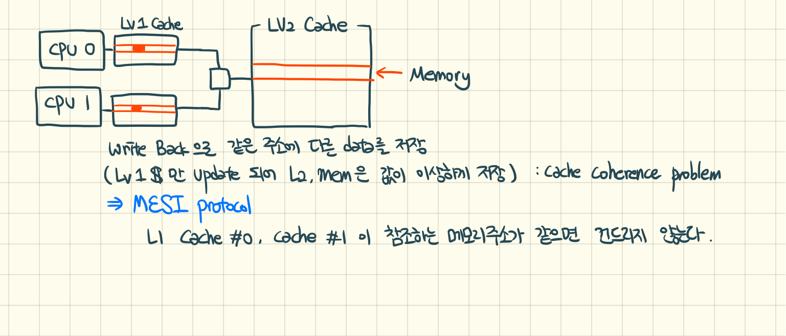 CPU마다 Lv1 Cache를 가지고있기에, 같은 주소에 다른 데이터를 저장할 가능성이 있다.