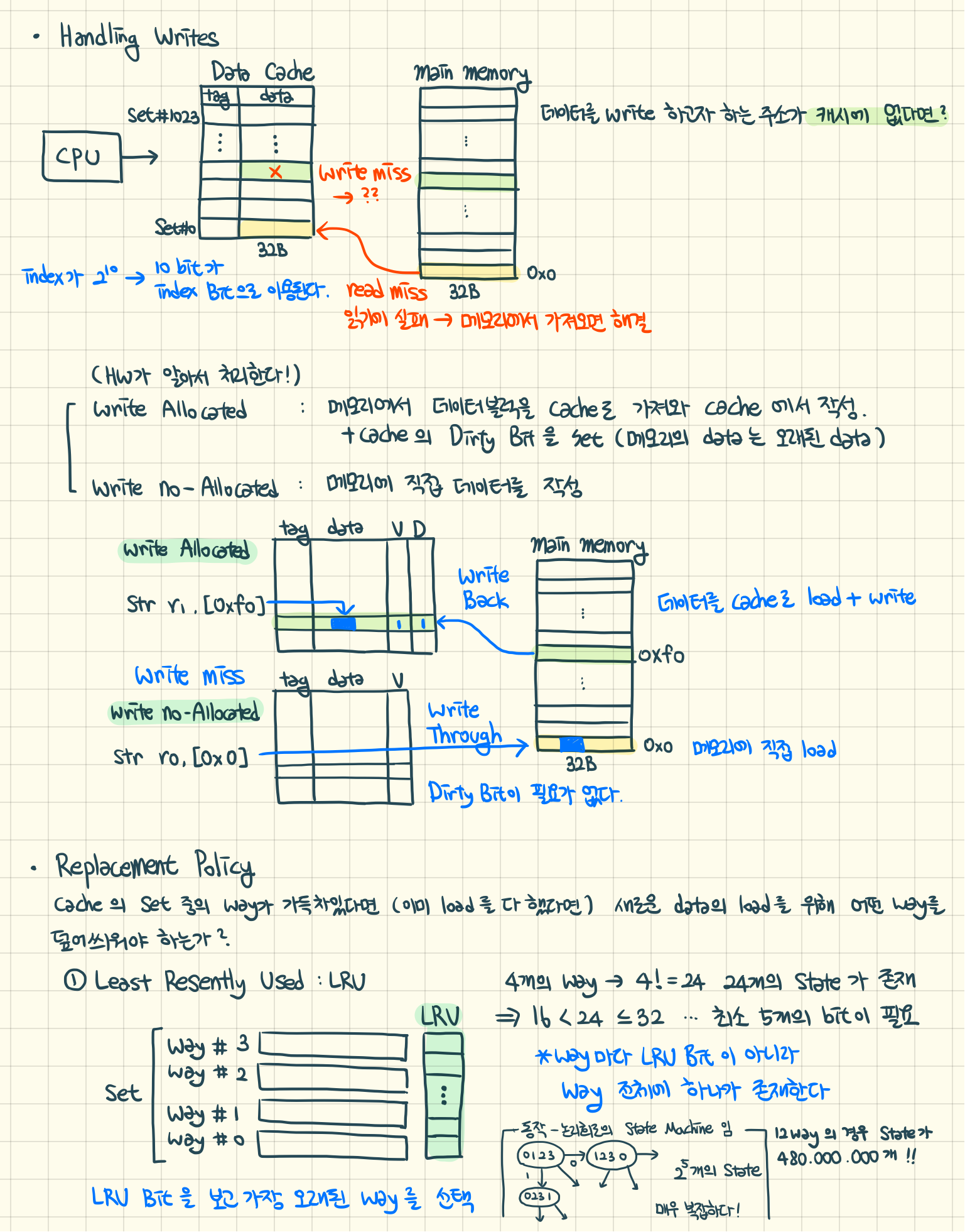 4개의 Way가 있다면 4!= 24 … 24개의 State가 존재하는 셈 ( 1234, 1243, 1324, 1342 … ) 따라서 4개의 Way를 처리하기 위해서는 16 < 24 < 32 이므로 최소 5개의 LRU Bit이 필요하다.