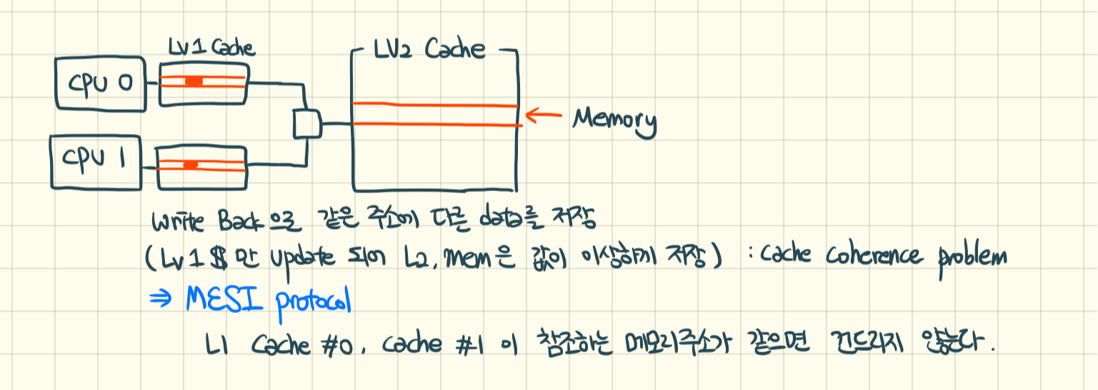 CPU마다 Lv1 Cache를 가지고있기에, 같은 주소에 다른 데이터를 저장할 가능성이 있다.