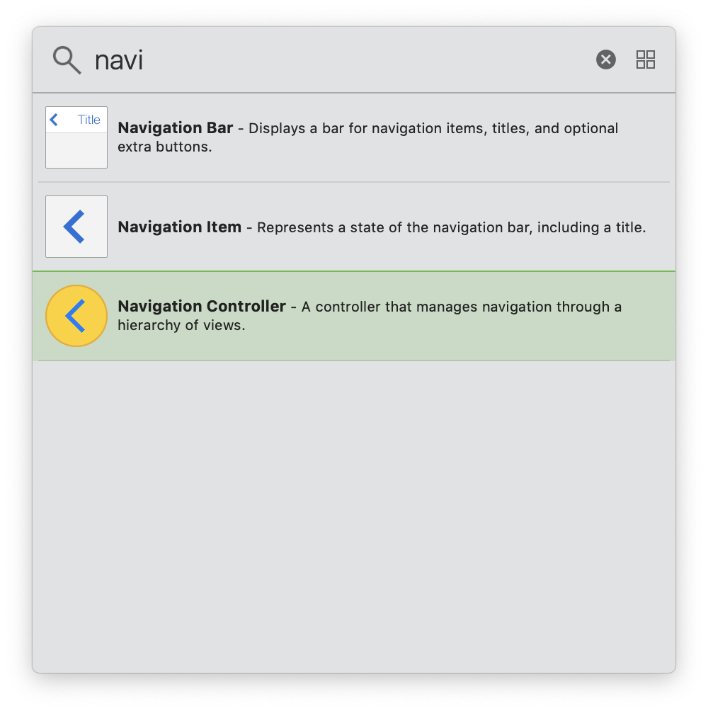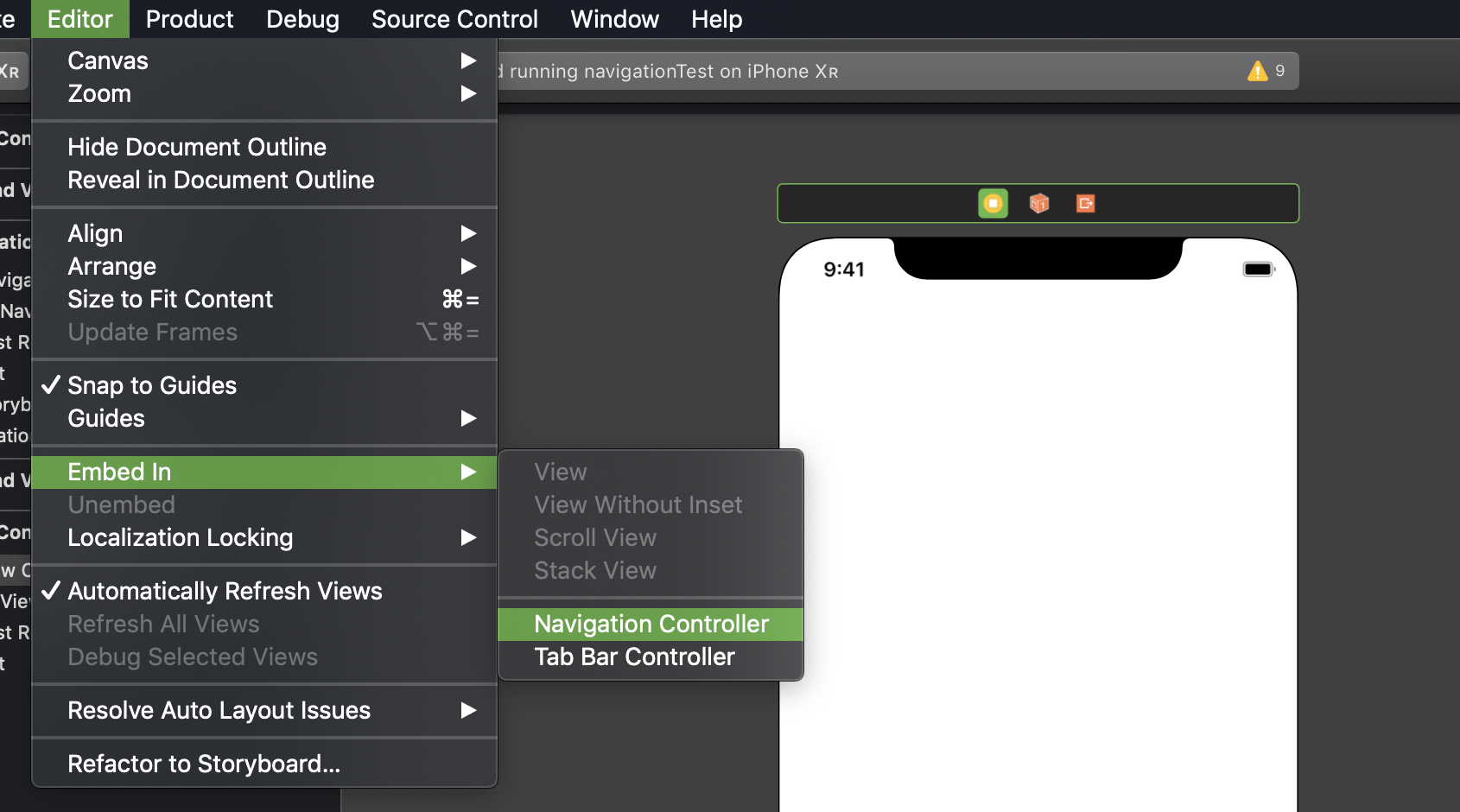 2. '⌘ + ^ + L'로 오브젝트 메뉴를 열고 Navigation Controller를 가져오면 됩니다.