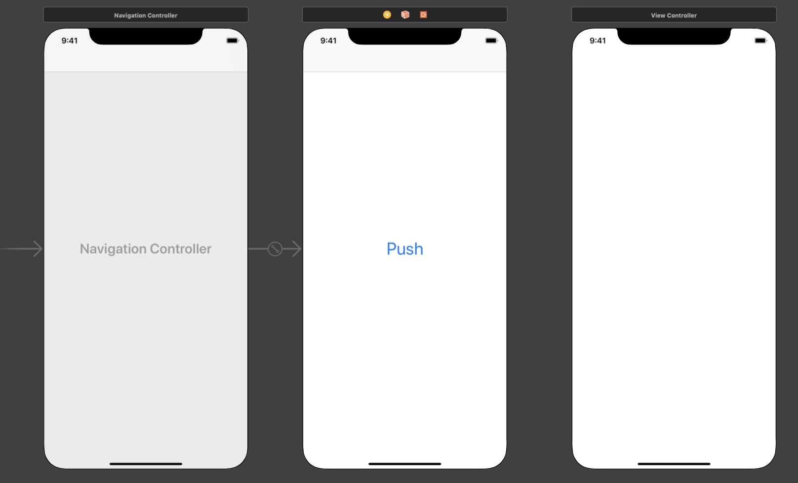Navigation Controller와 View Controller가 스패너? 모양으로 연결된 것은 루트 뷰 컨트롤러인 것을 알려주는 거예요. 현재 구조에서는 Push가 포함된 뷰가 가장 아래에 깔려있는 루트 뷰라는 의미죠!