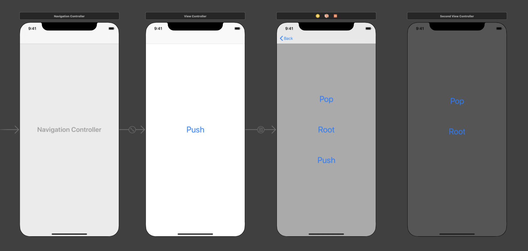 그 다음, 아래의 이미지처럼 View Controller를 3개 만들어봤어요. PopToRootView 메서드가 정상 적동하는지 테스트해봐야 하니깐요! 각각의 View에는 작동을 테스트해볼 함수들에 맞는 버튼을 만들어주고, 메서드들을 알맞게 연결을 해뒀습니다.