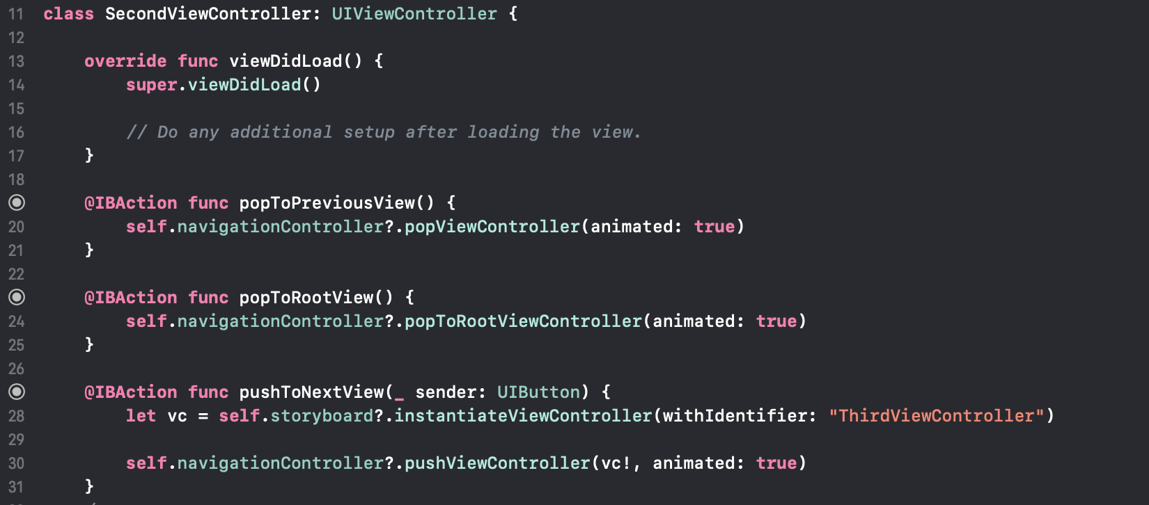 우선 SecondViewController라는 클래스를 하나 새로 만들어 작성해주었어요. 메서드 이름을 보면 알 수 있듯이 Push, Pop, 그리고 Root까지 한번에 모두 Pop하는 코드를 작성해주었습니다.