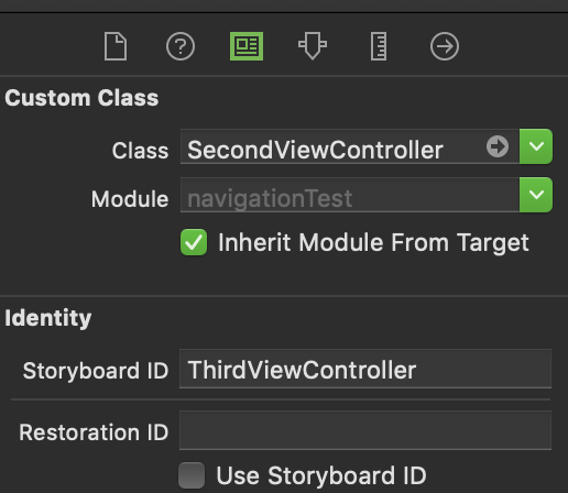 가장 오른쪽에 있는 View Controller의 경우, 오른쪽의 Inspector에서 Identity를 ThirdViewController라고 미리 정해줬어요. 지금 스토리보드를 캡쳐한 이미지에서도 볼 수 있듯이, 이전 View Controller와 아무 연결이 돼있지 않은 상황이기 때문에 Identifier를 보고 찾아갈 수 있도록 하기 위해서예요. 위에 작성해뒀던 코드의 Push에 해당하는 메서드를 보면 ThirdViewController라는 Identifier를 찾아서 연결하는 방식으로 코드를 짜뒀거든요!