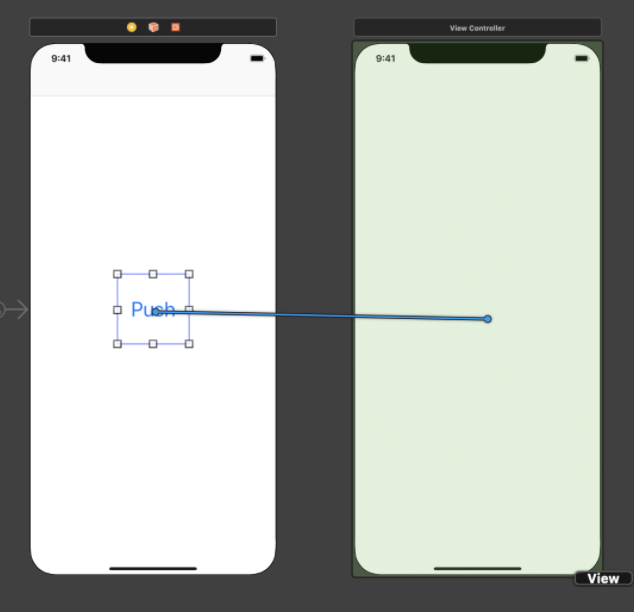 이 상태에서 Push 버튼을 선택하고, Control 키를 꾹 누르면서 Push에서 오른쪽의 View Controller로 커서를 드래그 해주면 됩니다.