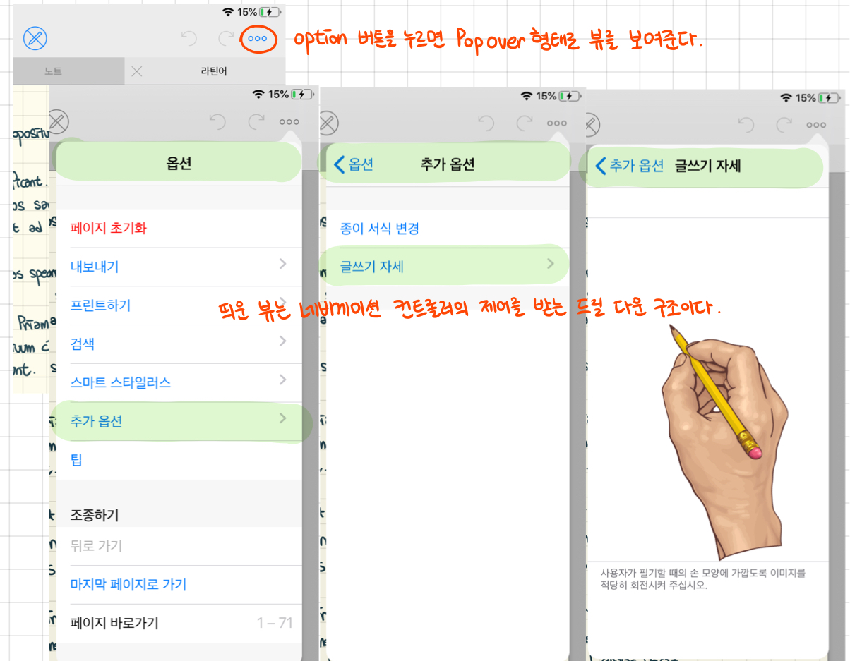 한편, 옵션 뷰 내에서는 깊이와 흐름을 가지게 됩니다. 종이에 대한 설정, 스타일러스에 대한 설정, 추가 옵션 등 설정에 대한 또 다른 흐름을 가지게 되는데, 이를 네비게이션 컨트롤러를 이용해 구현을 하면 자연스럽고 익숙한 흐름을 볼 수 있습니다. 위의 네비게이션 바를 통해 현재 구조 속에서 자신의 위치를 확인할 수도 있고, 선택지를 잘못 선택한 경우 뒤로 돌아갈 수도 있기 때문에 깊이 구조에서 유용하게 사용됩니다. 이것이 네비게이션이 수행하는 역할입니다. 흐름을 만들고, 깊이 구조에서 사용자가 길을 잃지 않게 하는 것!