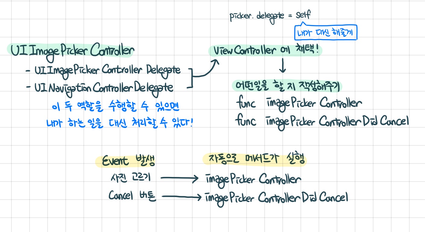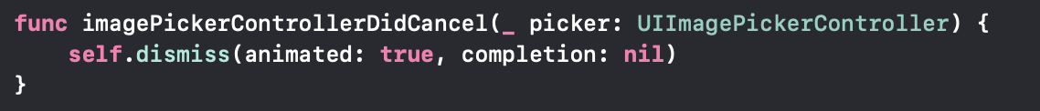 저는 여러 메서드 중에서 imagePickerController (사진을 골랐을 때 호출되는 메서드)와 imagePickerControllerDidCancel(사진을 고르지 않고 취소했을 때 호출되는 메서드)를 이용해줄거예요.