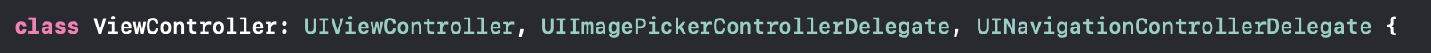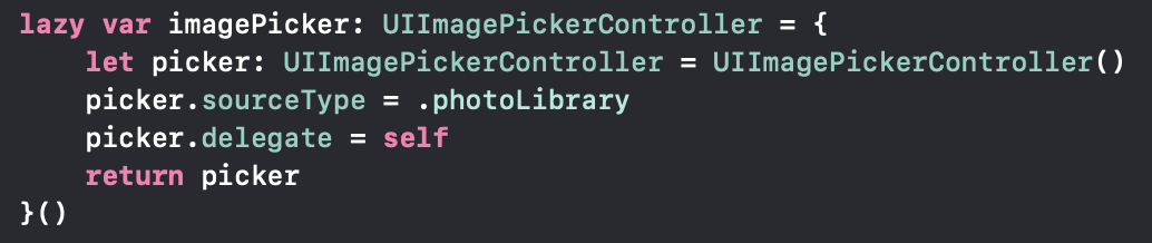 우선, imagePicker를 만들어줍니다. (사진첩에 접근해서 고를 수 있는 바로 그것!) UIImagePickerController 라는 타입으로 만들어줄 수 있고, instance에 여러 설정을 붙여서 imagePicker라는 이름을 달아줍니다. 여기에서 delegate에 self를 넣으면서 에러가 발생할텐데, 어떤 역할을 하면 되는지에 대한 전달을 못받은 상태에서 picker 대신 일을 하게 된다는 통보만 받아서 그렇다고 생각하면 편할 것 같네요!