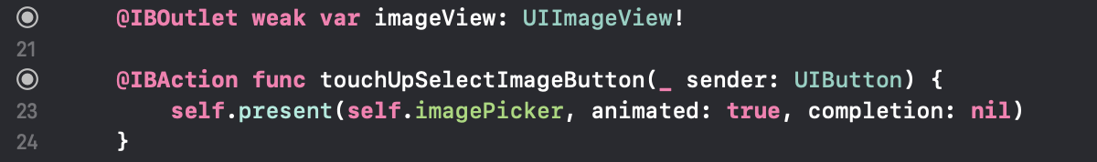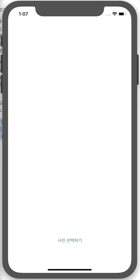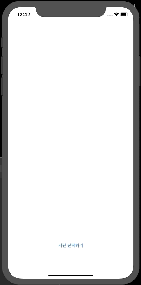 그 다음 스토리보드상에서 만들어준 imageView와 Button을 연결해줍니다. imageView는 @IBOutlet으로 값 (이미지)를 넣어줄 수 있게 가져오고, button은 눌렀을 때 위에서 만들어준 imagePicker를 Present 하도록 만들어줬어요. 지금 앱을 빌드하면 이런 형태가 됩니다. imagePicker의 기본 설정만 등록되어있어서, photoLibrary에 접근이 가능하지만, 이미지를 누르면 아무 반응 없이 올라온 뷰가 dismiss되는 상태예요. 여기서 사진을 ImageView에 띄우는 작업을 Delegate를 통해 만들어볼게요!