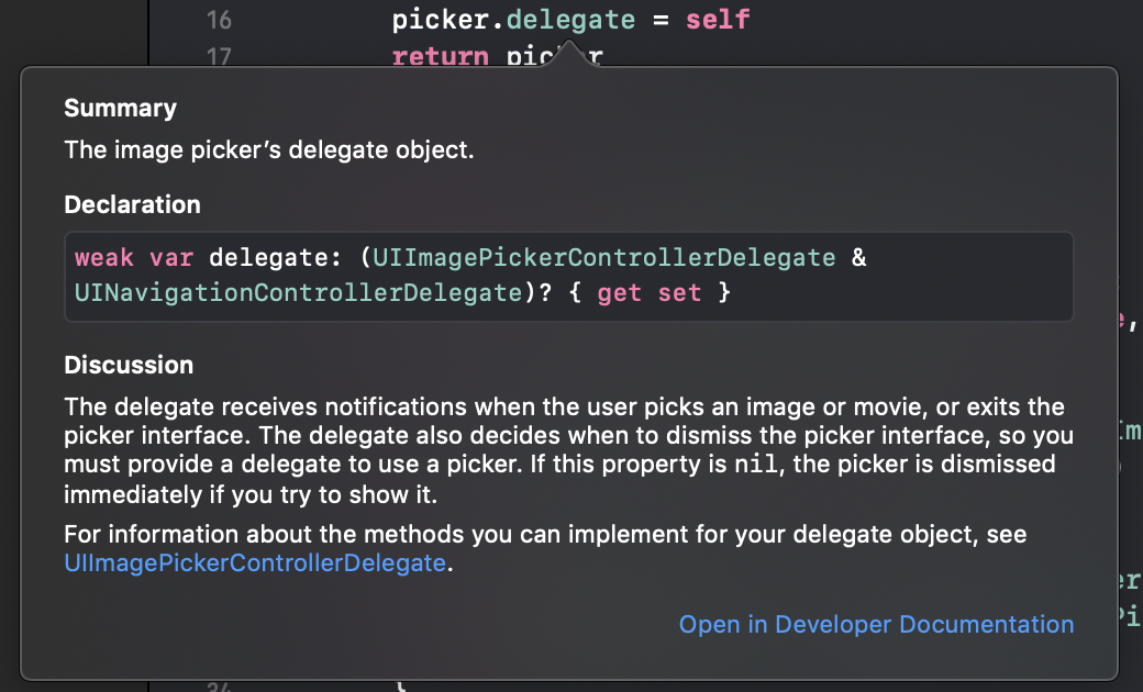 option 키 (^)를 누른 상태에서 picker.delegate를 눌러보면 다음과 같은 PopOver를 볼 수 있습니다. 설명을 보면 이 ImagePickerController 대신 일을 수행하려면 UIImagePickerControllerDelegate와 UINavigationControllerDelegate 두 가지 일을 할 것이라고 전달을 해줘야 한다고 적혀있어요. 그럼 이제 이 두 Delegate를 채택해주면 되겠죠?