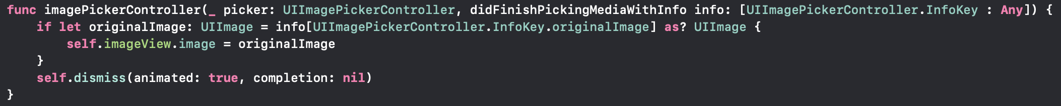 imagePickerController 로 메서드를 호출한 경우에는 (사진을 골라준 경우에는) 사진(Info)을 Key를 이용한 딕셔너리 형태로 제공해주네요. 어떤 Key로 접근할 수 있는지에 대해서는 공식문서와 도움말에 포함되어있습니다!! 문서를 읽읍시다!! ㅋㅋㅋㅋㅋ 무튼 info에서 골라준 사진 원본 ( UIImagePickerController.InfoKey.orignialImage ) 을 가져올 수 있다면 가져와서 imageView에 넣어주었습니다. 위의 gif처럼 아무 설정도 없는 상태에서는 사진을 고르면 자동으로 dismiss가 되도록 코드가 작성되어 있지만, 이렇게 직접 imagePickerController를 건드린 경우에는 dismiss에 대한 코드도 직접 작성해줘야해요. 아니면 사진을 눌러도 picker 창이 없어지지 않습니다. (이걸로 살짝 헤맸죠.. ㅋㅋㅋ)