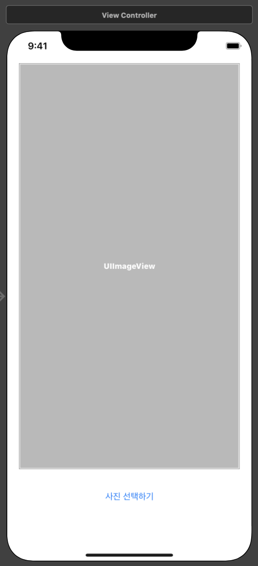 일단 스토리보드에서 화면을 다음처럼 만들어줍니다. ImageView는 사진을 보여주는 역할을 할 것이고, 버튼은 누르면 사진을 고를 수 있는 창을 올려주는 역할을 할 거예요.