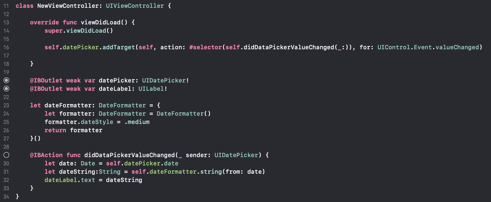 타겟으로 self를 지정해줬고, 액션으로 didDataPickerValueChanged라는 메서드를 등록해두고, 특정 Event로 값 변화를 지정해줬어요. 아래의 프로젝트 예시를 보면 좀 더 잘 이해가 될거예요.