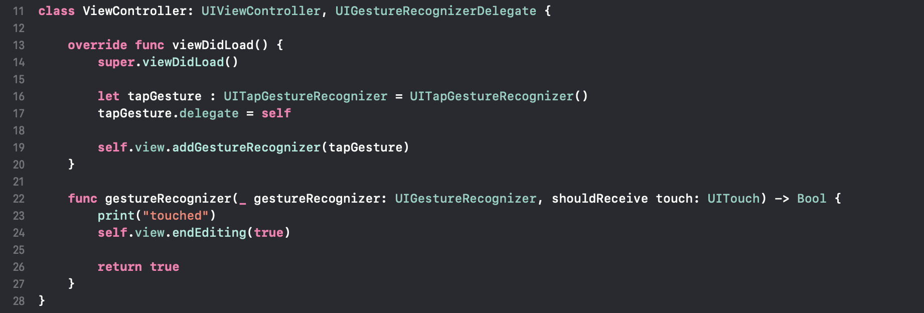 View Controller에서 UIGestureRecognizerDelegate 를 채택해주고, Gesture Recognizer 타입의 tapGesture를 만들어 view에 추가 및 delegate에 self를 선택해줍니다. delegate로 호출되는 메서드는 gestureRecognizer 예요. 해당 메서드안에 위에서 사용했던 코드를 넣어주고, return value만 추가로 작성해주면 됩니다.