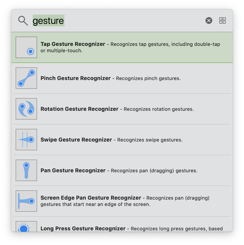 StoryBoard 상에서 View Controller에 Gesture Recognizer를 추가할 수 있습니다. (⌘ + shift + L)으로 접근하면 더 편하죠. Gesture Recognizer들이 아이콘으로 어떤 기능을 담고있는지를 직관적으로 보여주고 있어서 좋네요! ㅋㅋㅋ 이중에서 우리가 필요한 Tap Gesture Recognizer 를 골라서 뷰 컨트롤러에 추가해줍니다.