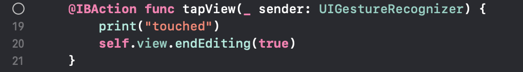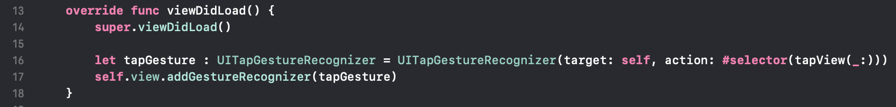 Recog를 추가하는 것은 화면에 로딩될 때 한 번만 실행해주면 되는 내용이기 때문에 ViewDidLoad() 함수 안에 넣어줄게요. UITapGestureRecognizer 타입의 tapGesture를 만들어주는데, 인자로 Target과 Action을 전달하도록 되어있죠. 액션에 대한 메세지를 전달할 타겟은 이 클래스이니 self, 액션은 위에서 작성했던 코드를 그대로 사용해서 tapView를 사용해줬습니다.