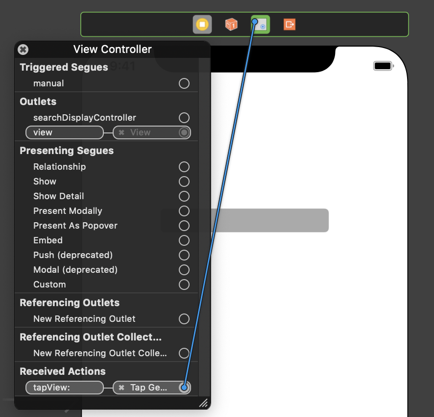 이 방법에서는 Gesture Recognizer를 View Controller에 StoryBoard 상에서 추가해주지 않아도 됩니다. 코드에서 타겟-액션을 지정한 Gesture Recognizer를 View Controller에 추가해줄 것이거든요.