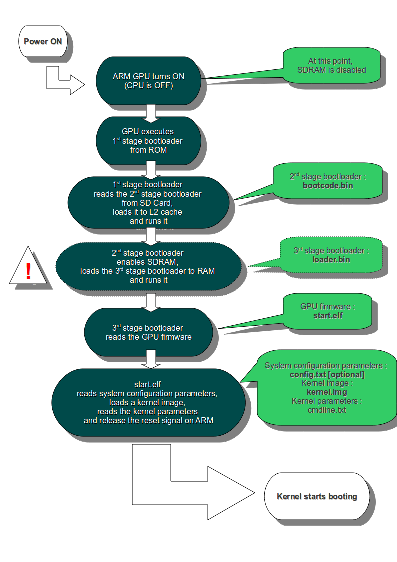 라즈베리 파이의 부팅 과정 (간단 version)파워 온! → GPU가 먼저 켜진다. (CPU는 죽어있는 상태)1단계 부트로더 (ROM) : GPU가 이걸 ROM에서 실행. 이 단계에서 SD Card에서 2단계 부트로더를 찾음2단계 부트로더 (bootcode.bin) : SDRAM의 활성화. 이 단계에서 RAM에 3단계 부트로더를 로드3단계 부트로더 (start.elf) : GPU Firmware로 동작하며, 커널 이미지를 읽어옴커널 부팅 준비 (start.elf) : 시스템 설정을 읽고, 커널 이미지 로드 + CPU에게 제어권 넘기기커널 부팅 시작 : 리눅스 커널이 CPU에서 실행되기 시작ㅤㅤ라즈베리 파이는 GPU가 주도권을 가지고 부팅을 시작한다.단계별로 나눠둔 이유? 각 단계마다 필요로 하는 메모리..