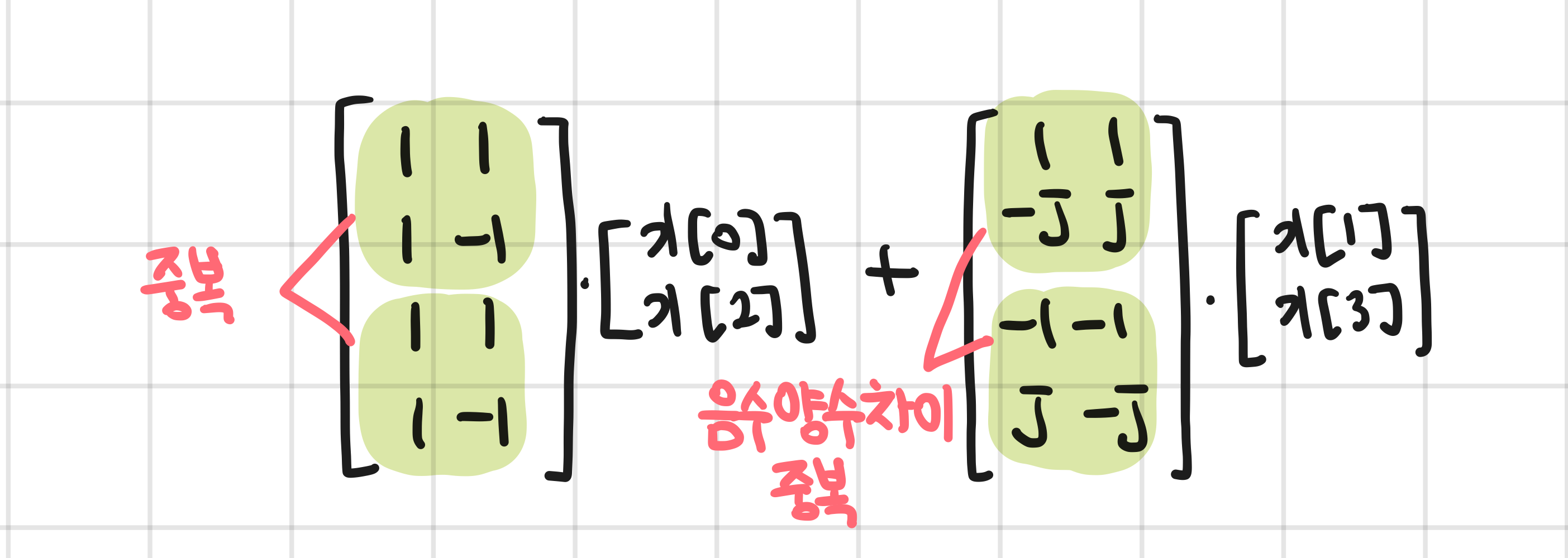 Fast Fourier Transform앞서 확인한 DFT Matrix 를 이용해 연산을 처리하면 반복되는 연산을 미리 끝내두고, 병렬 연산의 적용이 가능해 연산 처리 효율이 높일 수 있기는 하지만, 여전히 $O(n^2)$ 의 연산량을 가진다. 혹시 중복되는 계산이나 계산 결과를 재사용할 수 있는 부분이 있을지에 대해 고민한 결과, Fast Fourier Transform (이하 FTT) 에 대한 컨셉이 나오게 되었다.ㅤ$N=4$ 인 상황을 다시 가져와 생각해보자.$$\left[\begin{matrix}X_0\\ X_1\\X_2\\X_3\end{matrix}\right] = \left[\begin{matrix}1&1&1&1\\1&-j&-1&j\\1&-1&1&-1\\1&j&-1&-j\end{matrix}\..